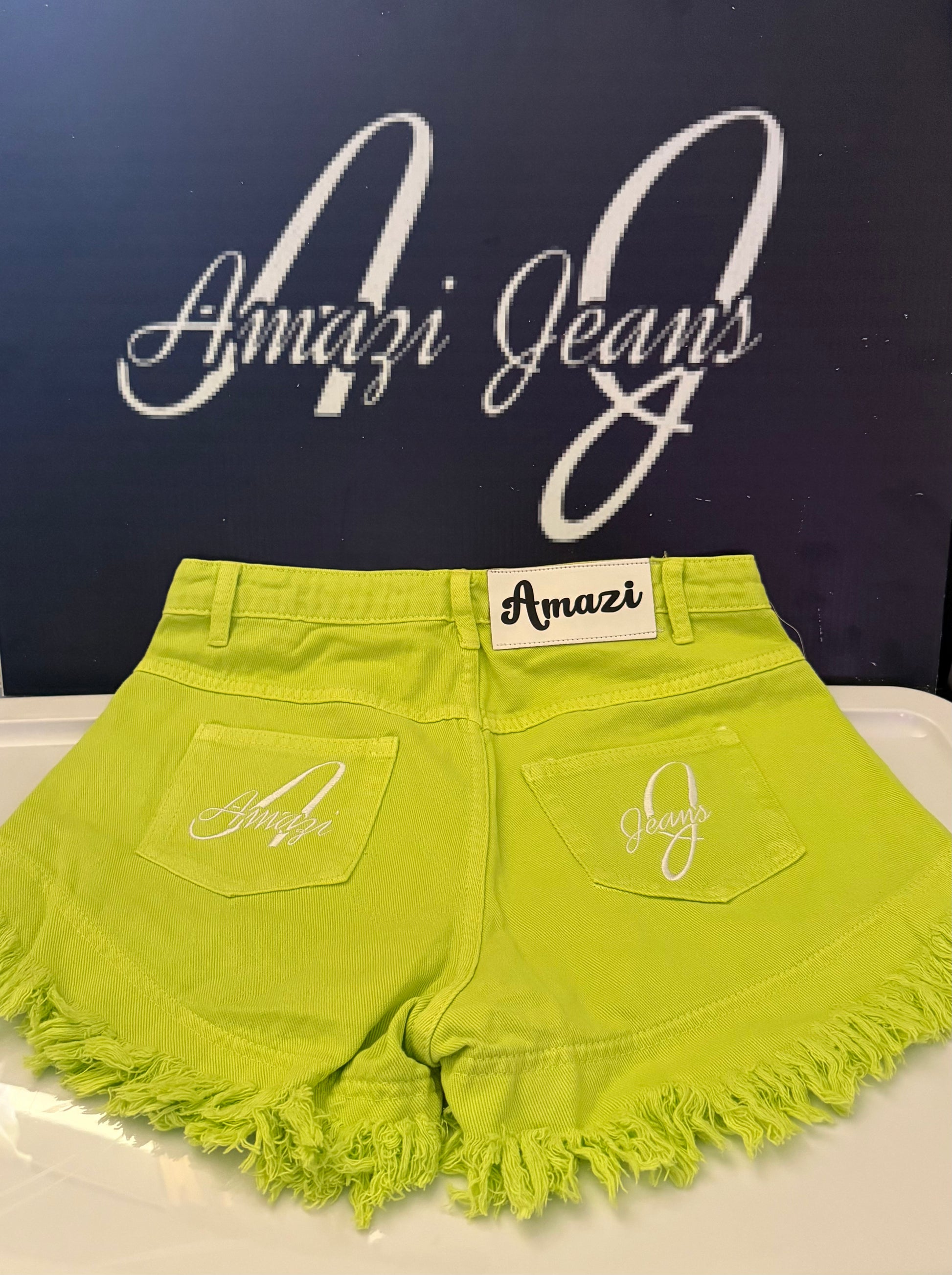Bright, bold, and unapologetically stylish — the Amazi Jeans Neon Green Fringe Shorts are your new summer essential. Designed with a flattering high-waisted fit and crafted from durable premium denim, these standout shorts feature edgy frayed hems and exclusive white logo embroidery on both back pockets. One side reads “Amazi,” the other “Jeans” — a bold stamp of signature streetwear style.
